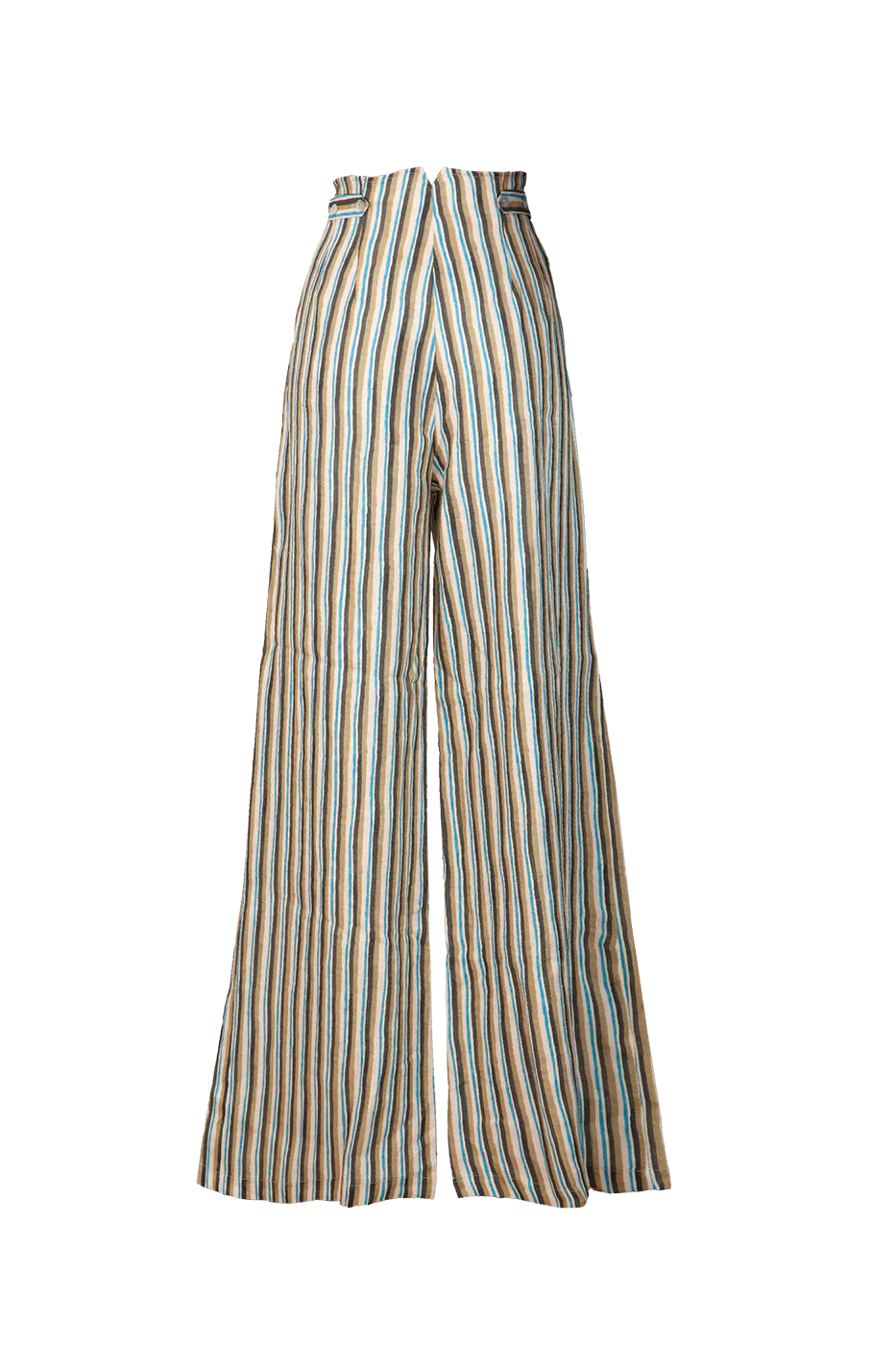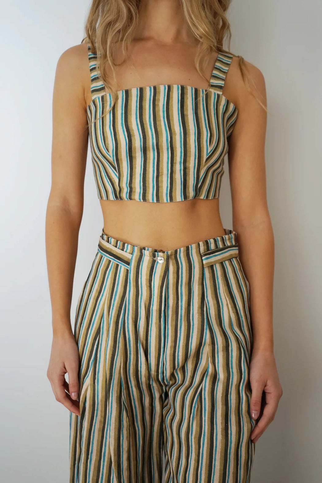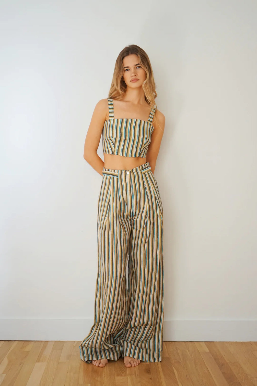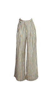 Striped Palazzo-style high waisted trousers pleated at the waist with an adjustable strap on the back. Our most sought after trouser, you won’t want to take it off let alone share it with your sisterhood.