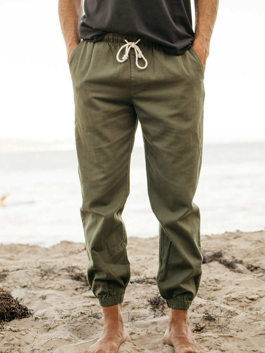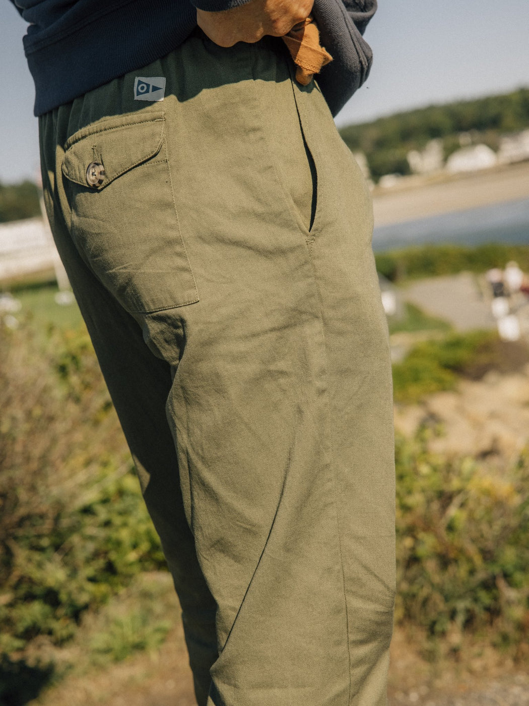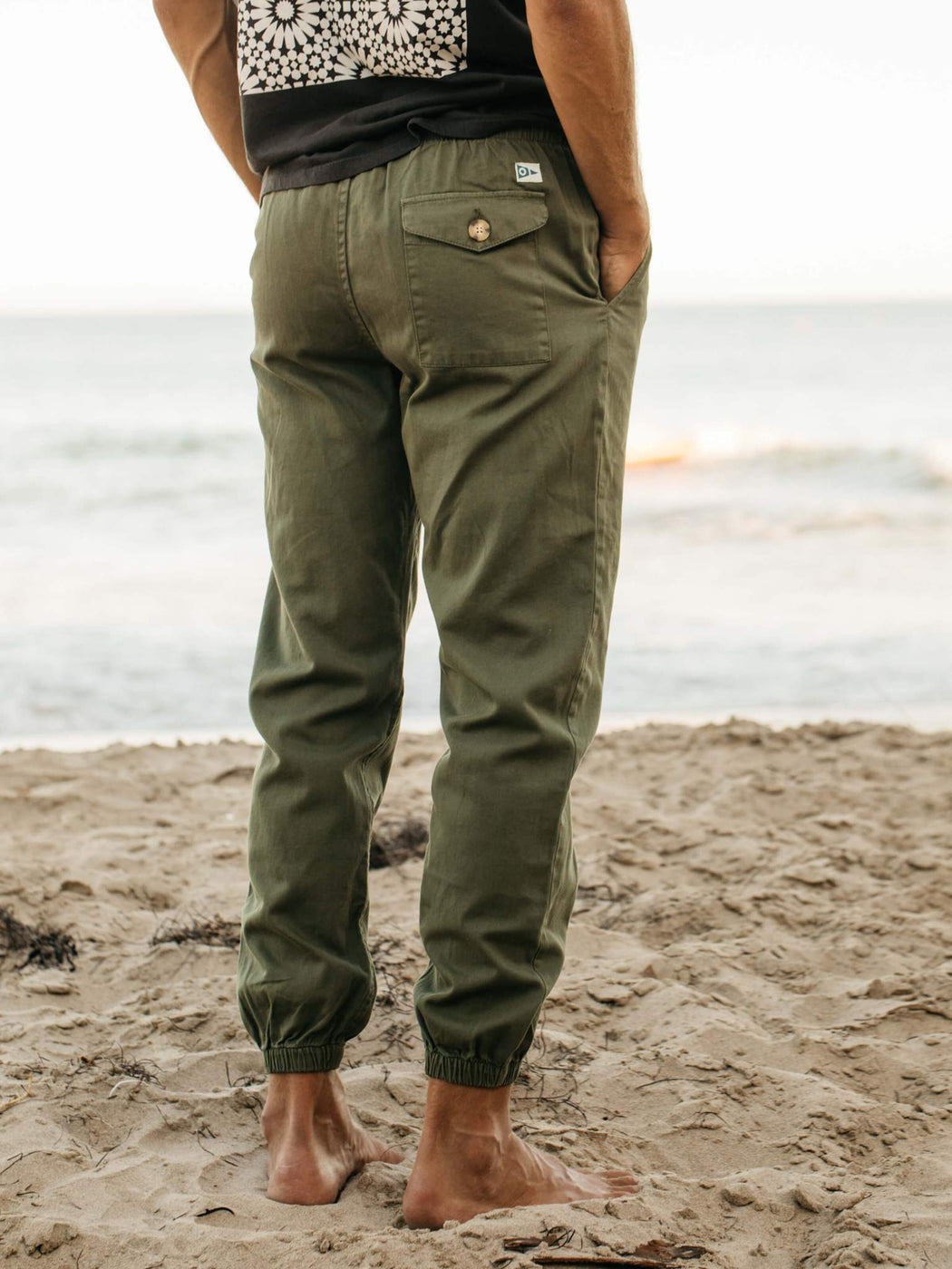 Somewhere in the perfect middle, combining the ease of an everyday chino and the comfort of sweatpants, The Jeffrey Pants are the perfect pant to slip on post-surf or a weekend trip to the beach followed by brunch. A tapered fitting Cotton twill pant that features slant front pockets, a back patch pocket, elastic at the waist with an adjustable drawcord and elastic at the cuffs.