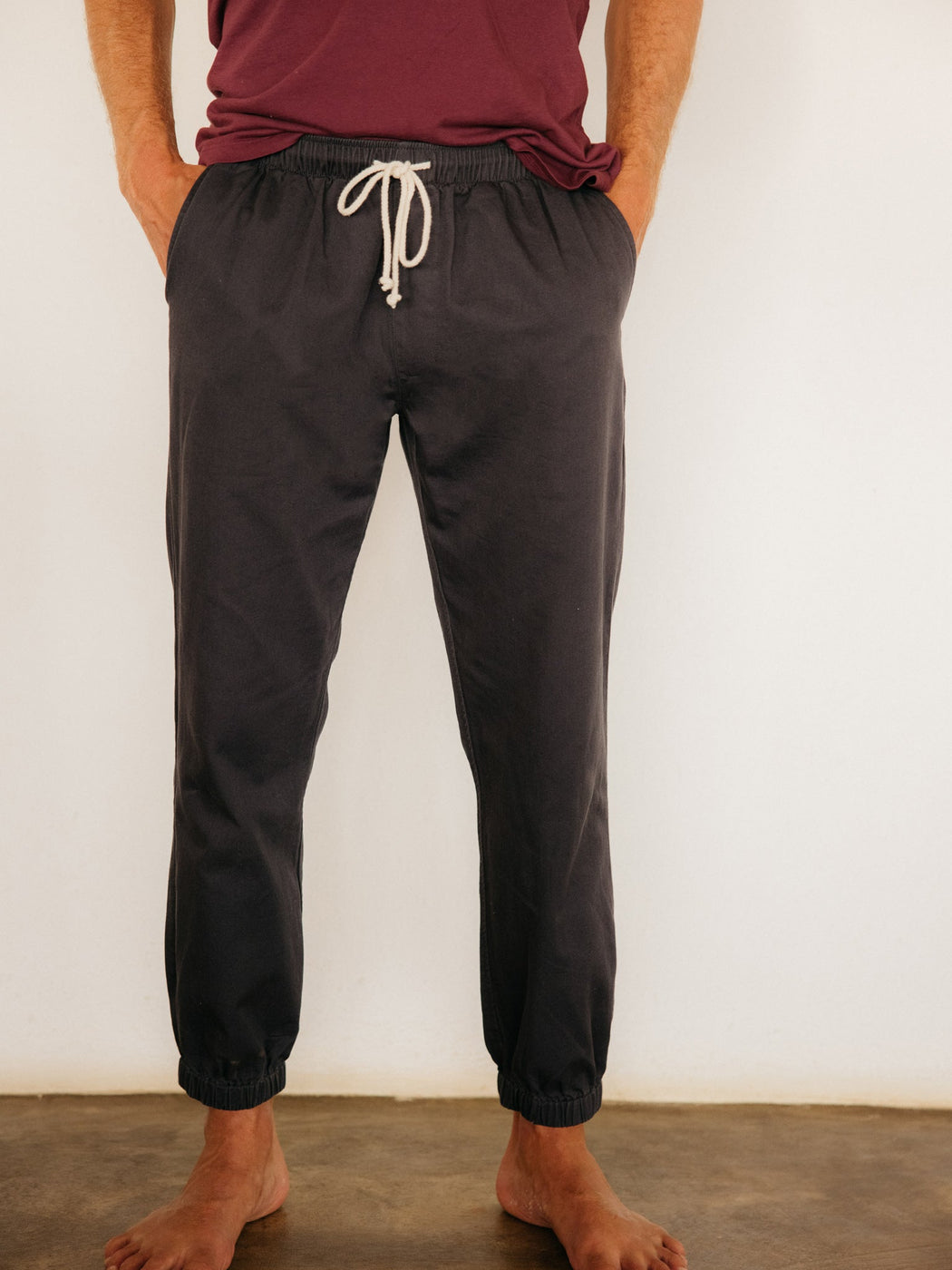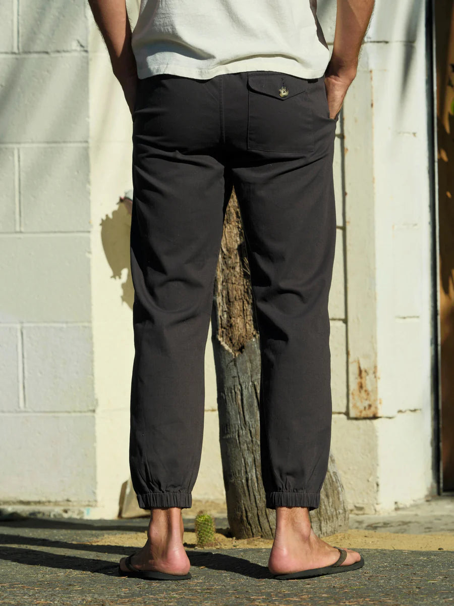 Somewhere in the perfect middle, combining the ease of an everyday chino and the comfort of sweatpants, The Jeffrey Pants are the perfect pant to slip on post-surf or a weekend trip to the beach followed by brunch. A tapered fitting Cotton twill pant that features slant front pockets, a back patch pocket, elastic at the waist with an adjustable drawcord and elastic at the cuffs.