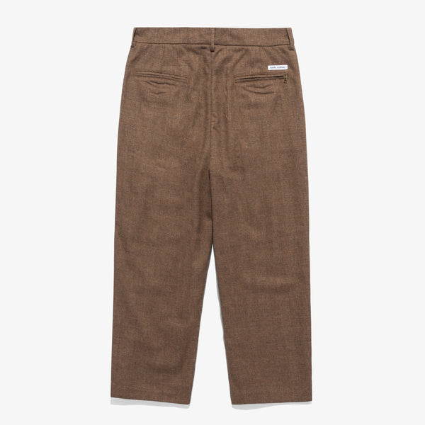 Saint fit, Pleated, Plaid fabric, Front slash and back welt pockets, Hook and eye closure, Recycled polyester woven labels, FSC® approved paper swing tags.